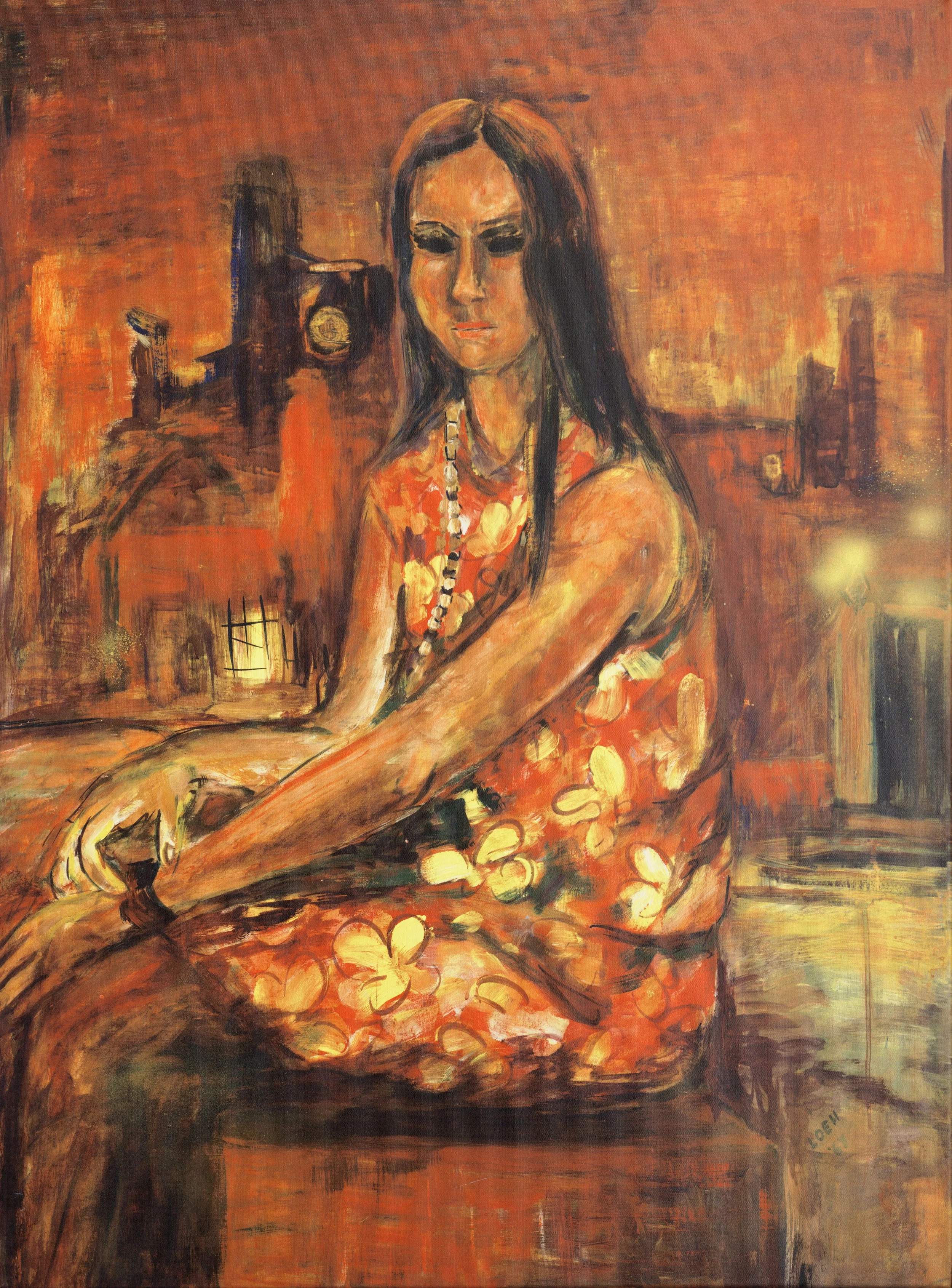 This piece, featuring a vibrant orange hue coupled with complex shading, showcases one of Corinne Loeh’s many mysterious muses.