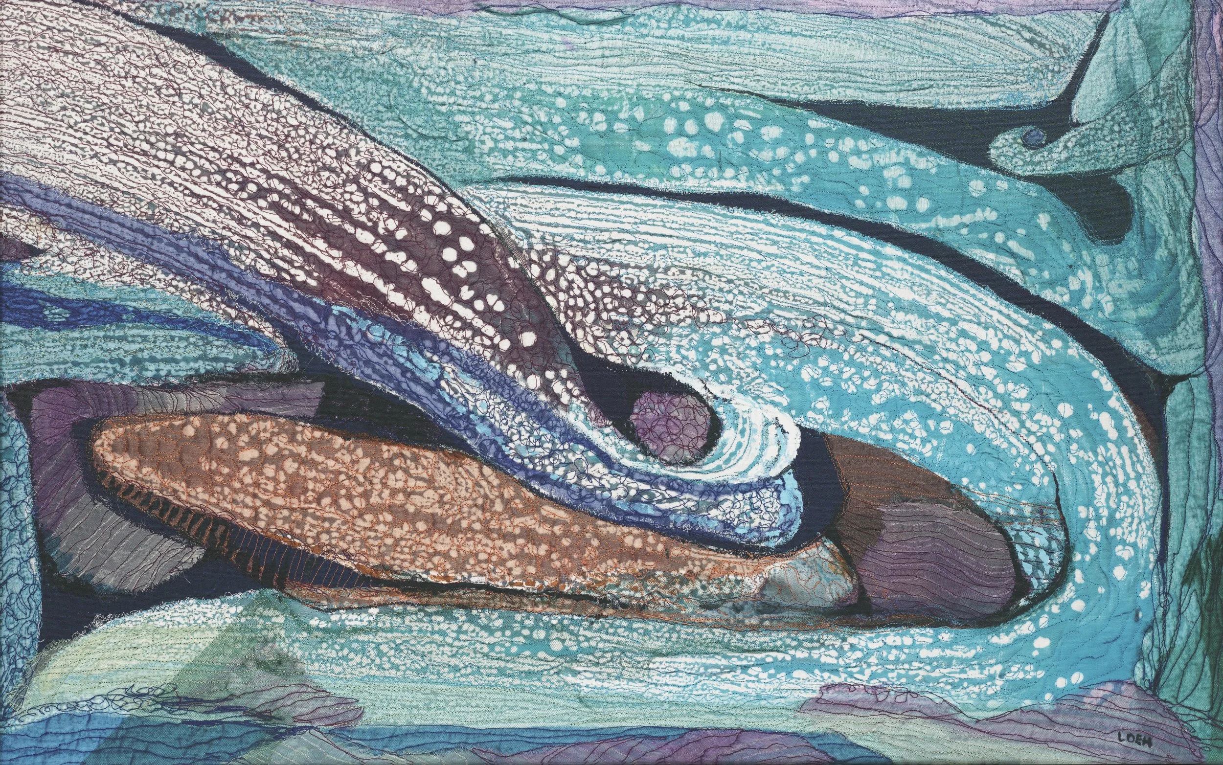 Mermaids, the “elite” in the fish world, live in an imaginary place deep under the ocean where nebulous sea creatures move gracefully through their domain. A queen mermaid watches intently as her daughter cavorts with an underling – a mere “fish”. Adoring sea creatures distract the wary queen with jewels and treasures from sunken ships. All is found in “Mermaid Retreat”.