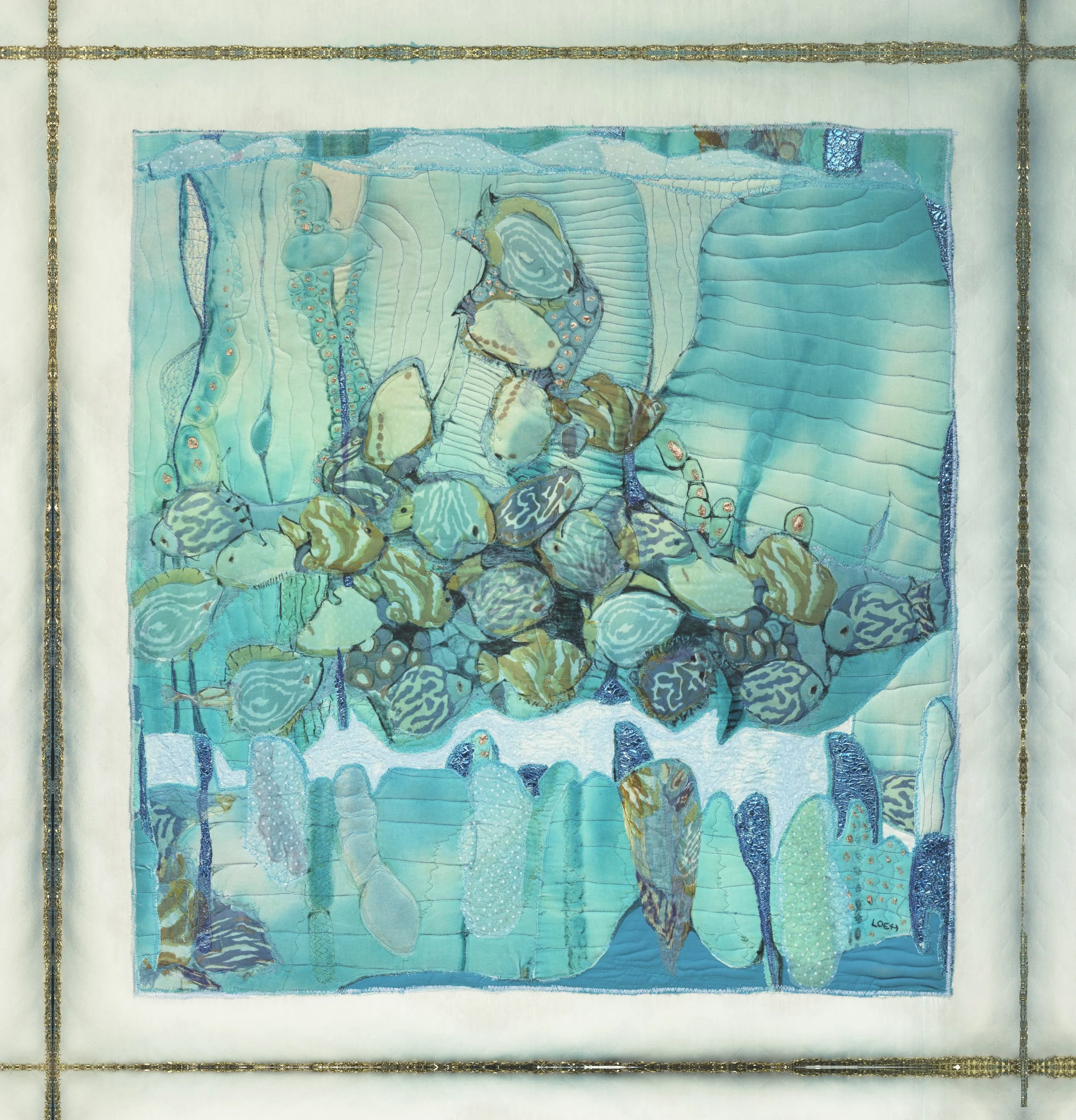 Originally painted on fabric, this piece shows a unique depiction of a school of fish, swimming about and enjoying each other’s company!