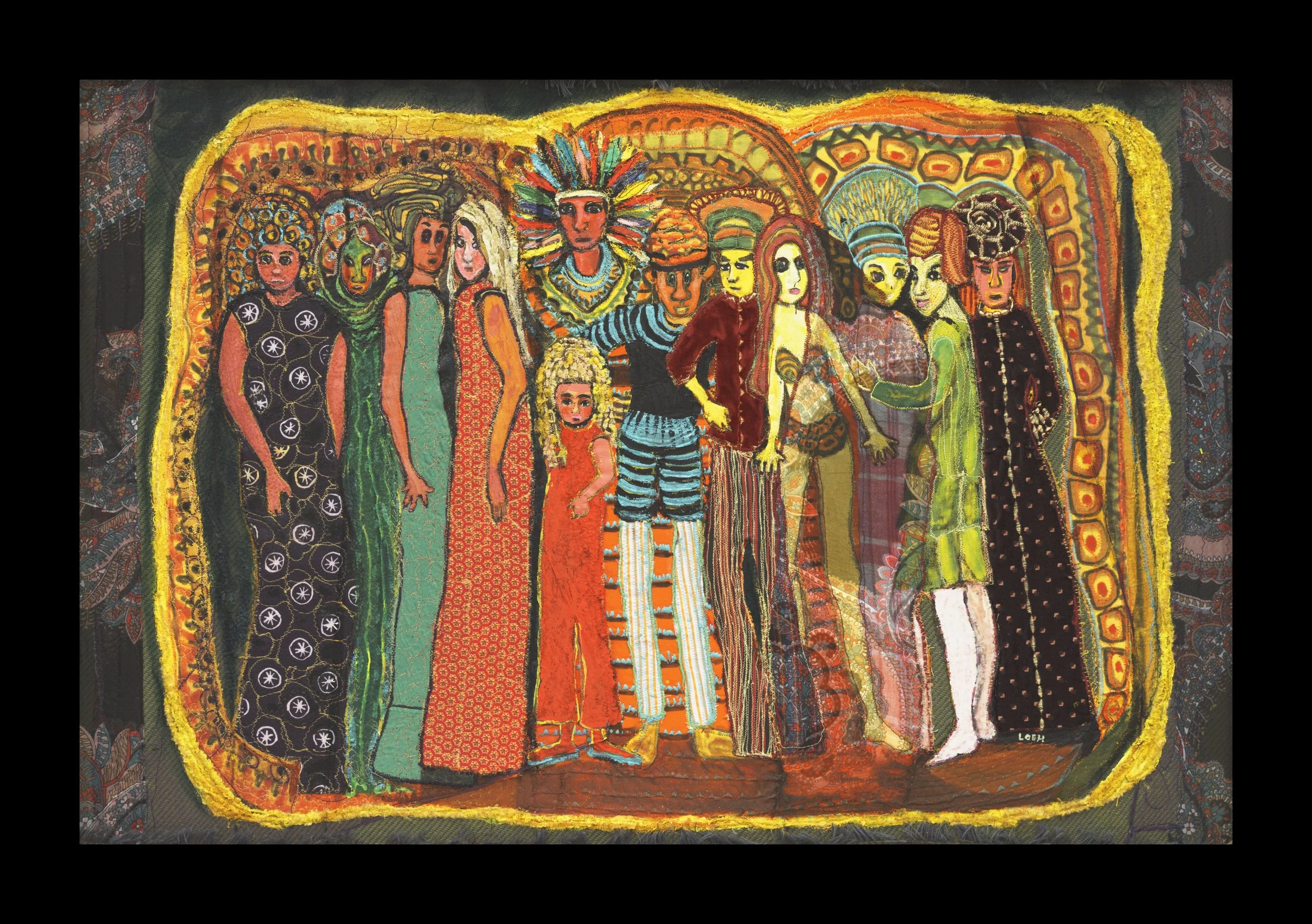 This fiber collage was formed by cutting apart previously dyed velvet, reassembling the pieces, and embellishing the composition with machine stitchery.